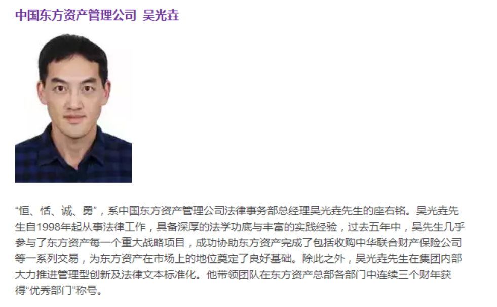 Asia Legal Business mentioned in the review that Mr. Wu, with his profound legal knowledge and rich practical experiences, has been engaged in legal work since 1998. In the past five years, Mr. Wu participated in almost every COAMC’s large-scale strategic project, and assisted COAMC in completing deals like acquiring China United Property Insurance. Furthermore, Mr. Wu has greatly promoted managerial innovation and standardization of legal documents. The legal department under his leadership has won the “Outstanding Department”title for three consecutive fiscal years.