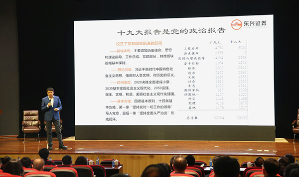 On the occasion of successful conclusion of the 19th National Congress, Zhang Anyuan – Chief Economist of Dongxing Securities gave a keynote speech titled “High-quality Development Outlook in a New Era” to the customers present. In his speech, Mr. Zhang Anyuan interpreted the meaning of economy part in the report of the 19th National Congress and shared his judgment about the policy trend and prediction of future investment direction with the customers present.