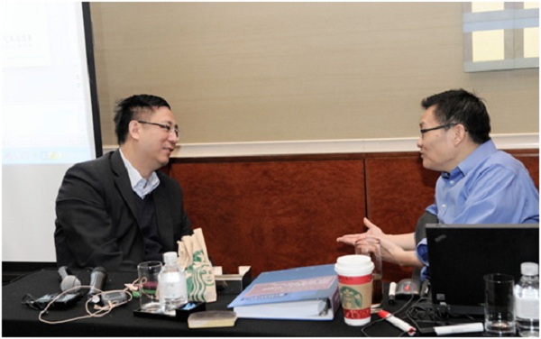 ▲ President Zhang Zi’ai communicating with Liao Jianwen, Vice-dean of CKGSB.